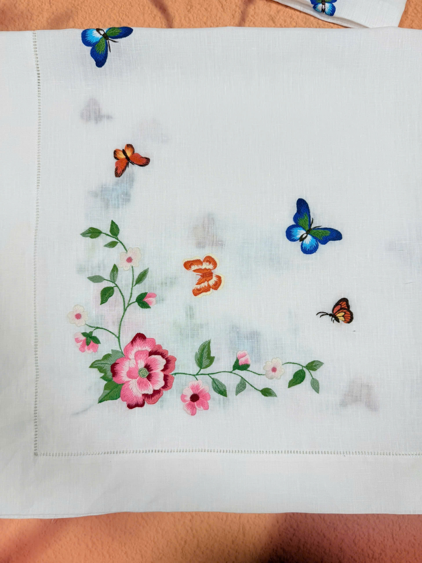 - Chi tiết trang trí: Một góc khăn sử dụng kỹ thuật rút chỉ viền (hemstitch) tạo thành những ô vuông nhỏ tinh xảo, một kỹ thuật thủ công truyền thống giúp tăng thêm giá trị thẩm mỹ và vẻ cổ điển.
